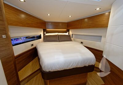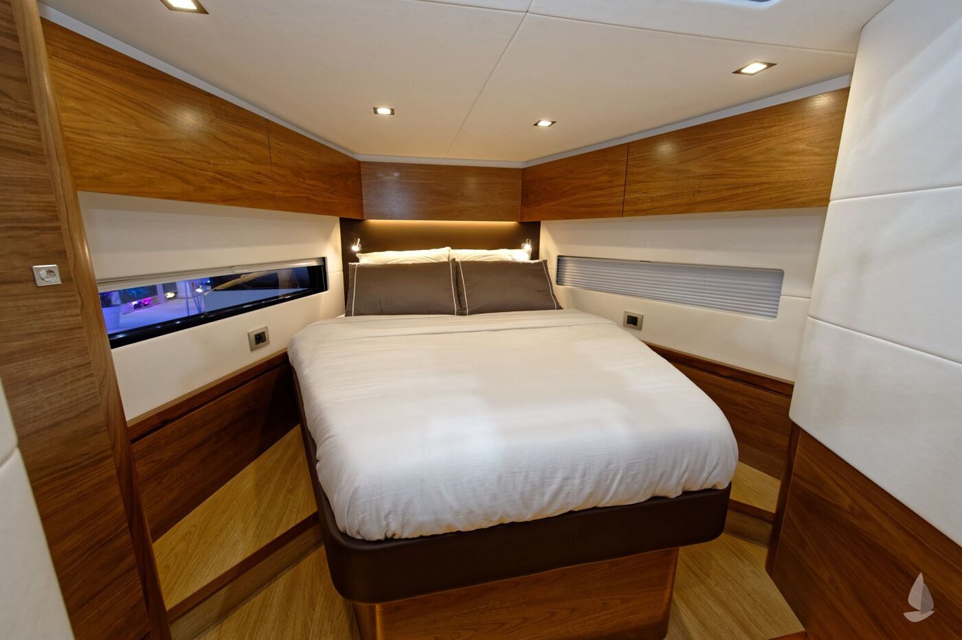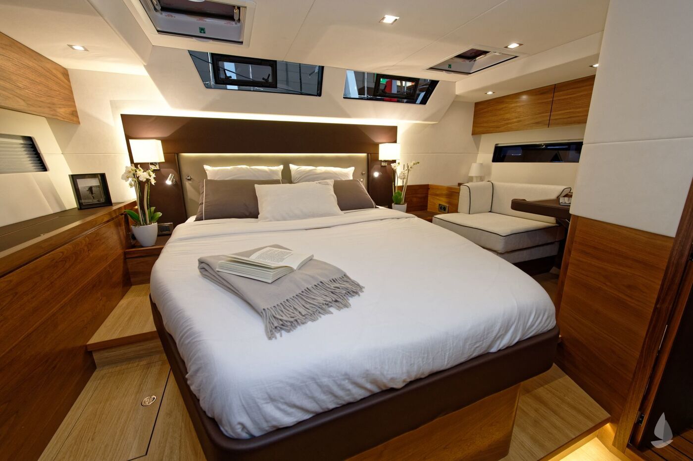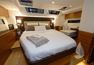 CabinesEigenaarshut achter met centraal tweepersoonsbed, tweepersoonshut voor met centraal bed, hut voor aan stuurboord met stapelbed